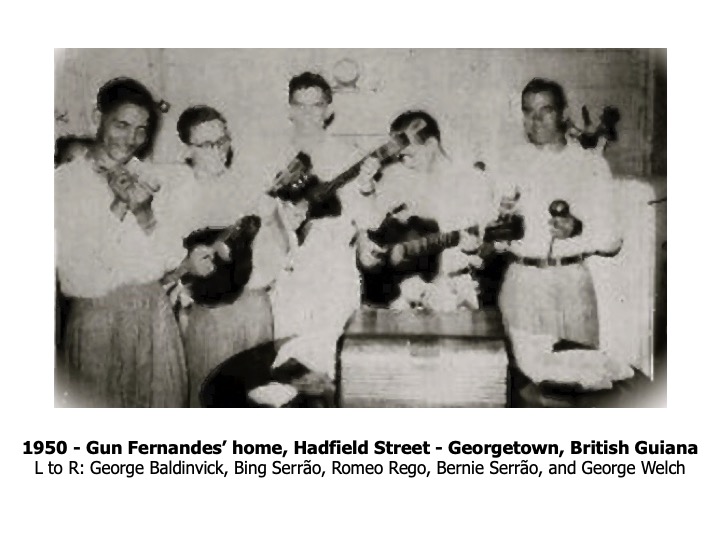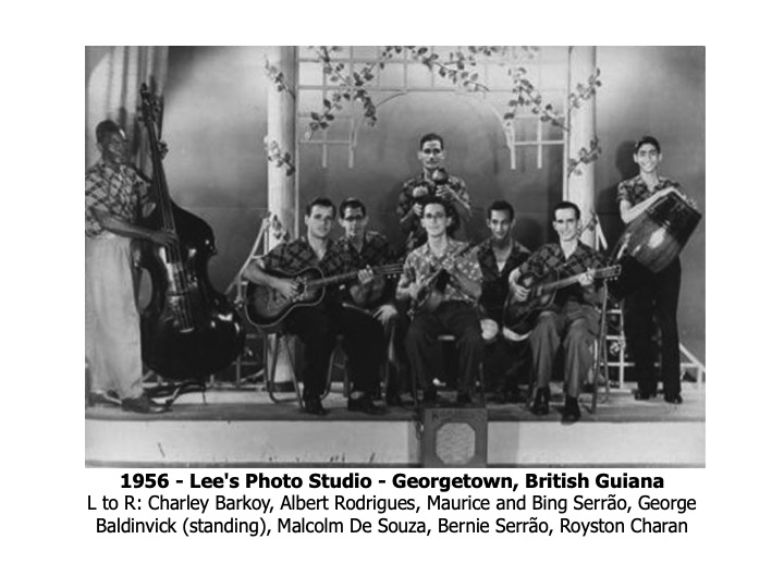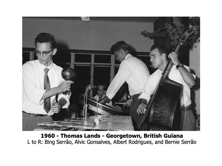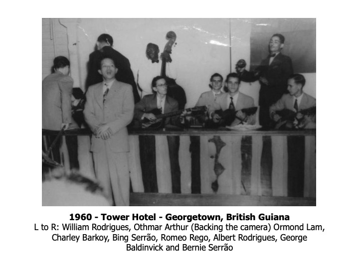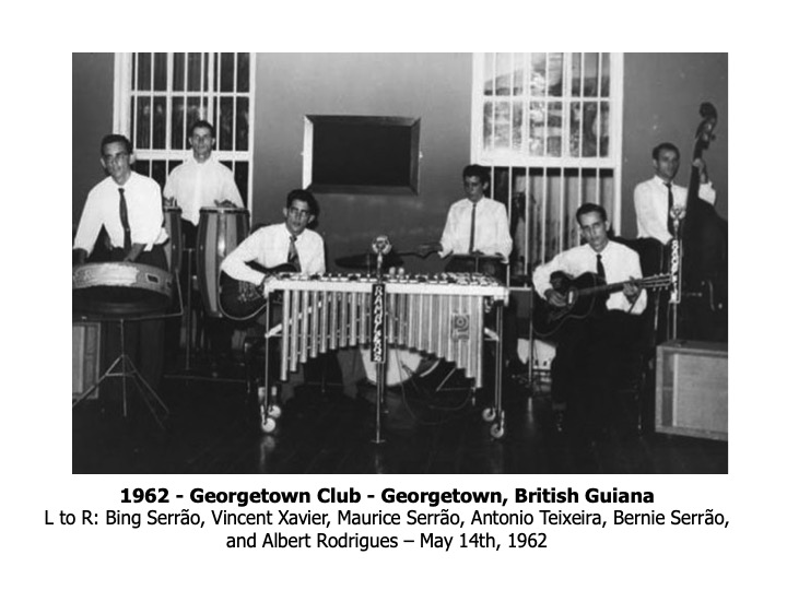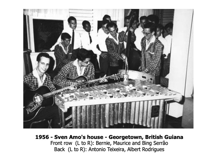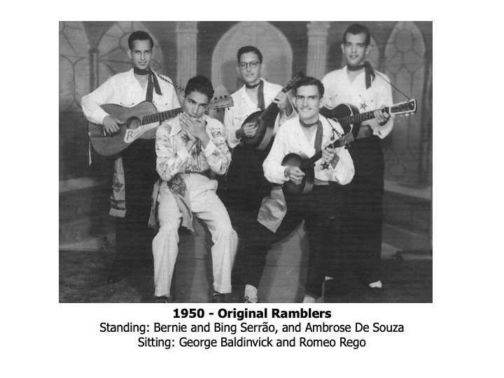 The story of the Ramblers goes back to around 1950 in Georgetown, British Guiana when the last three siblings of the Serrão family started playing with make-believe guitars, made of empty herring cans with a wooden pole protruding, and four rubber bands with wooden heads to “tune” the guitar. In 1953, the Serrão brothers formally started the band with several friends – Michael Andrews, Romeo Rego, Mark Steele and Ambrose De Sousa. The band was in great demand for dances, house parties and charity concerts produced by “Auntie Olga” Lopes-Seale, “Honest John” Fernandes and The Ivy Campbell Dance School. Other well-known Guyanese artistes performing at these memorable concerts were “Raoul” Jack Cashmere, Nesbit Chhangur, Othmar Arthur, Willie Rodrigues, Ormond Lam and Oscar Dummett